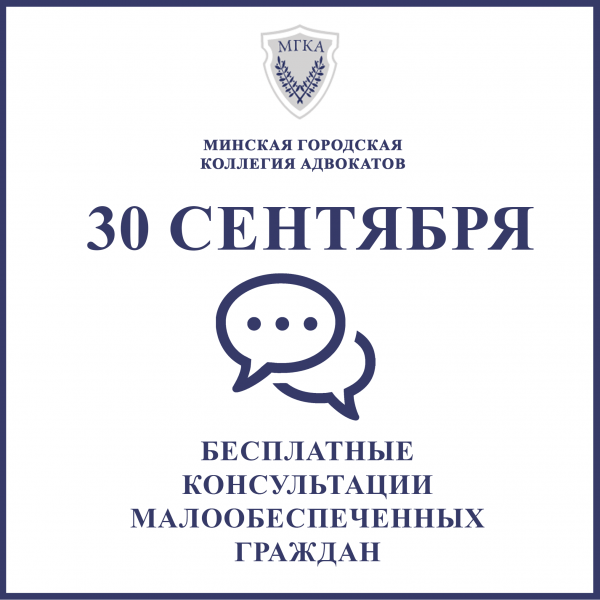 27 Сентября 2022Адвокаты Минской городской коллегии адвокатов 30 сентября проведут бесплатный приём для малообеспеченных граждан по случаю дня пожилых людейАдвокаты Минской городской коллегии адвокатов 30 сентября проведут бесплатный приём для малообеспеченных граждан по случаю дня пожилых людей. Акция будет проводится в форме устных консультаций по вопросам, не связанным с предпринимательской деятельностью и не требующими ознакомления с документами.Читать далее