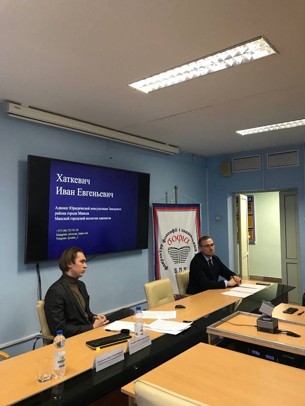 На факультете философии и социальных наук БГУ в формате диалоговой площадки прошла встреча с адвокатом юридической консультации Заводского района г.Минска Хаткевичем Иваном.
