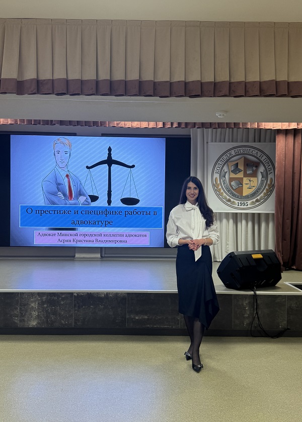 Адвокат юридической консультации №2 Советского района г.Минска Асрян Кристина Владимировна выступила с лекцией перед учащимися ЧУО «Колледж бизнеса и права» 8 октября 2025 года.